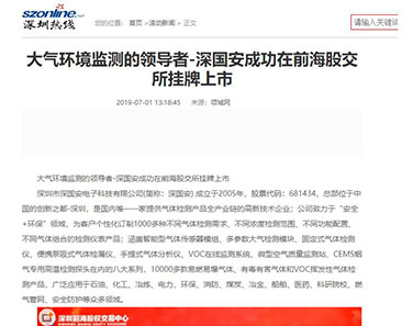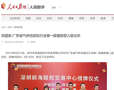 2019年6月19日,深圳市深國安電子科技有限公司作為廣東省氣體檢測儀行業強勢登入股交所,掛牌前海股交碼為:681434,樹立了行業標桿。人民日報社、鳳凰網、中華網、中國財經時報網、騰訊網、新浪網、搜狐網、未來網財經、中國安防行業網、慧聰網、北國網、中國應急網、太平洋安防網等眾多媒體進行了報道。